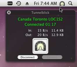 To detach, simply tap the "Disconnect" catch in this window, or right-tap the Tunnelblick symbol and select "Disconnect" there.