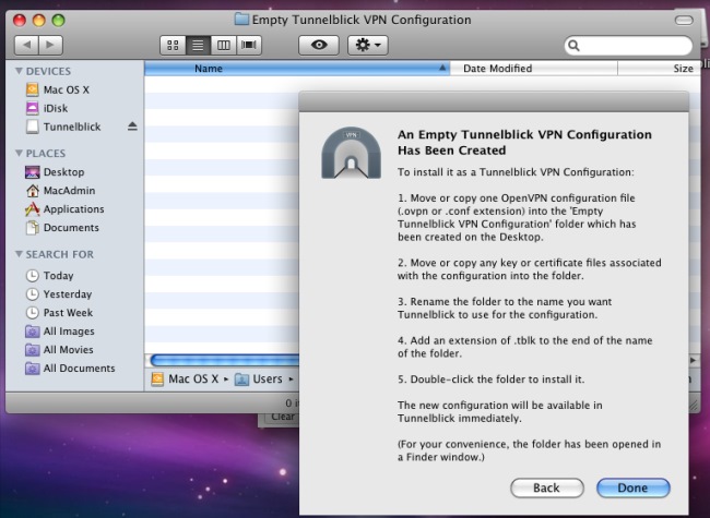 Tunnelblick ought to now have made another organizer on your desktop called "Empty Tunnelblick VPN Configuration",