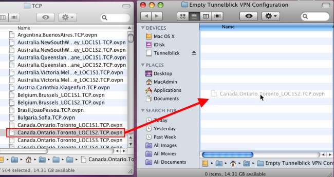 Next, simply drag a solitary *.ovpn record from a server you'd like to use into the "Empty Tunnelblick VPN Configuration" organizer: