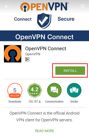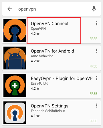 Open Google Play app, search for “OpenVPN”. Click on the first search result “OpenVPN Connect”.