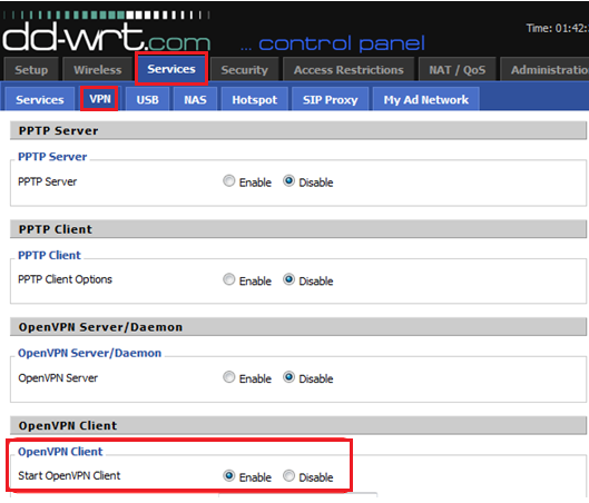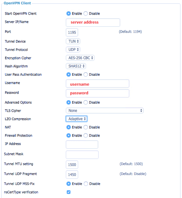 Under “OpenVPN Client”, “Enable” “Start OpenVPN Client” option to reveal OpenVPN configuration panel.
