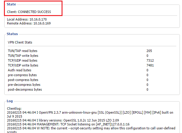 If connection was successful, you should see under “State” “Client: Connected Success”.