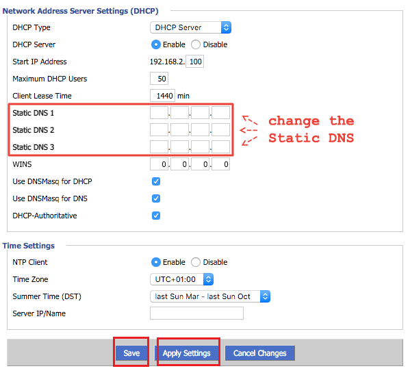 Under “Network Address Server Settings (DHCP)”, apply the following instructions: