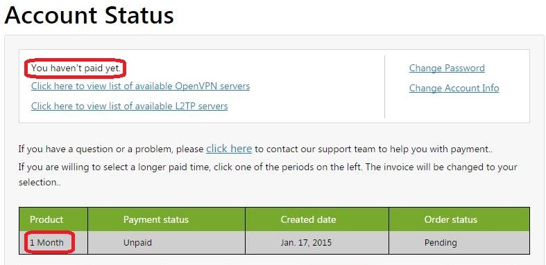On the left side of the screen, click on the VPN package you are willing to buy (by default, you'll find an unpaid invoice for one month, but you can change it).