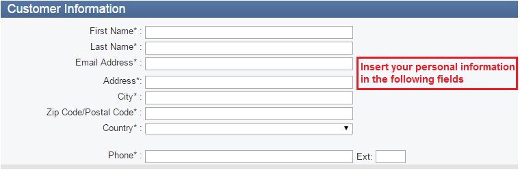Fill in your information (First Name, Last Name, Email Address, Address, City, Zip Code/Postal Code, Country, and Phone) in the “Customer Information” section.
