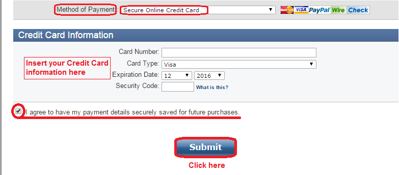 Insert your Credit Card information (Card Number, Card Type, Expiration date, and Security Code), then click “Submit”.