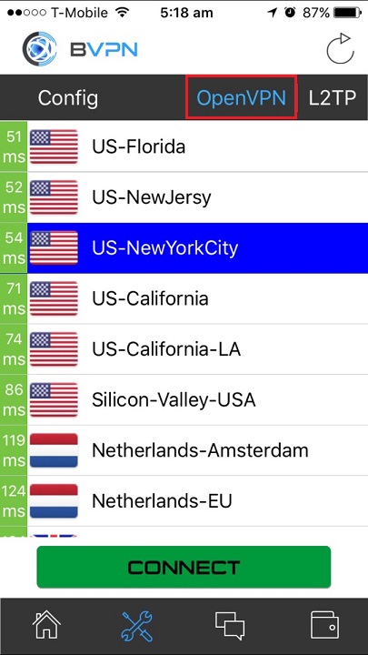 Tap “OpenVPN”. A list of availbale servers will appear with hints of ping reply next to each server.
