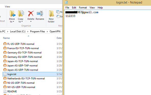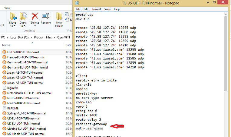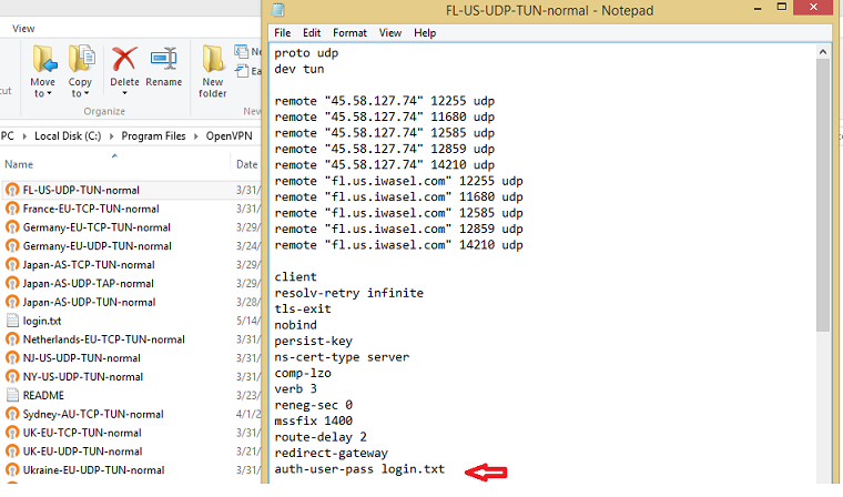 Now double click the name of the config file. In the pop up window, look for the line “auth-user-pass” and change it to “auth-user-pass login.txt” and save the changes you’ve made to the file.